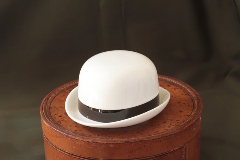 The sugar bowl is inspired by the surrealist artist Magritte who used a lot of depictions of bowler hats as well as the cheeky cartoon characters Thomson and Thompson (French: Dupond et Dupont) who accompany Tintin in his adventures; we came up with the sugar bowl hat.